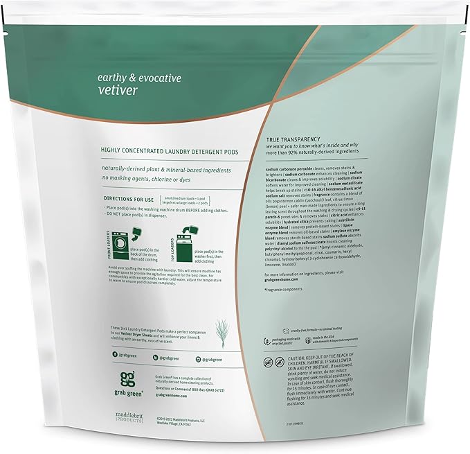 • Contains: 1- 132 Pod Bag of Grab Green Natural Vetiver 3in1 Laundry Detergent Pods. Our velcro closure bags are convenient and easy to use, no hassling with frustrating zip closures