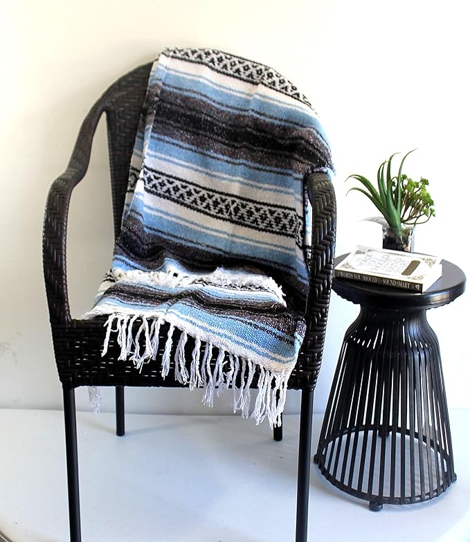 Del Mex Classic Mexican Blanket, Large Authentic Woven Falsa Throw (70"x50"), Artisan Southwest Décor for Beach, Yoga, Outdoors (Light Blue)