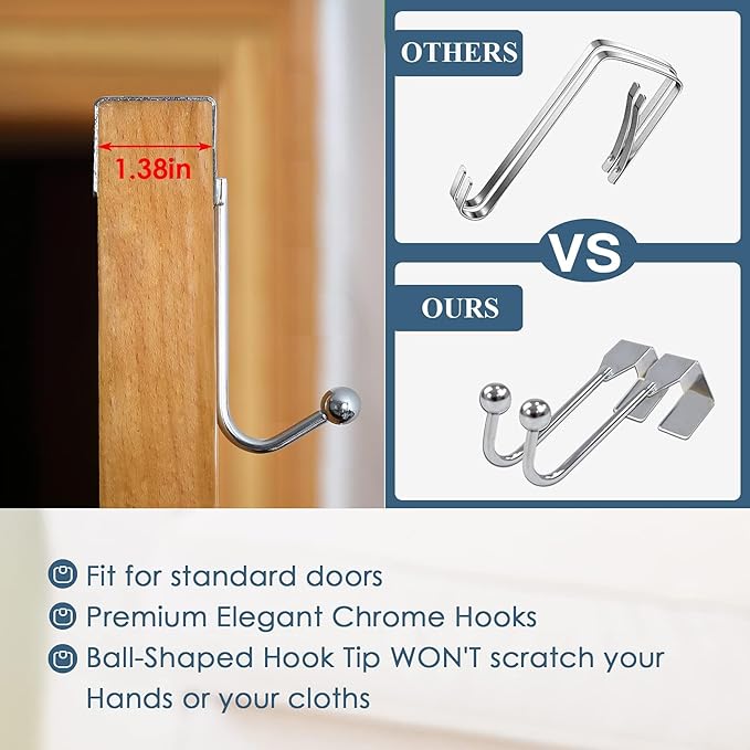 - 2 Wide Metal Hooks & Adhesive- The 1.38â wide over-door hooks are specially designed with BALL-SHAPED HOOK TIPS to avoid scratching clothes or fingers. Premium THICKNESS & WIDTH ensure the hooks hang stably on the door. They never deform, slide out of place, or scratch your door easily like those cheaper hooks. Two damage-free adhesives are included for your use.