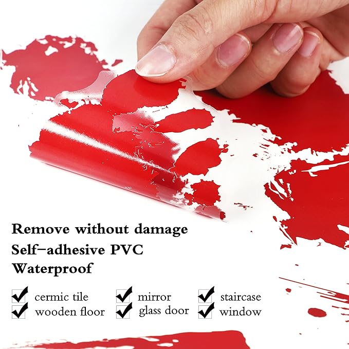 • Measurement - Footprints Size:7" x 3.2". Bloodstain Size:among 1.4”to 5.6”.Shoes Print Size:8" x 3.8".Zombie Hands Size: 5" x 3.5".Small Handprint Size:5" x 3.5".Big handprint Size:5" x 6.9".Restroom Sign Size:9.3" x 6.6".