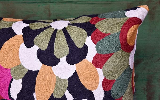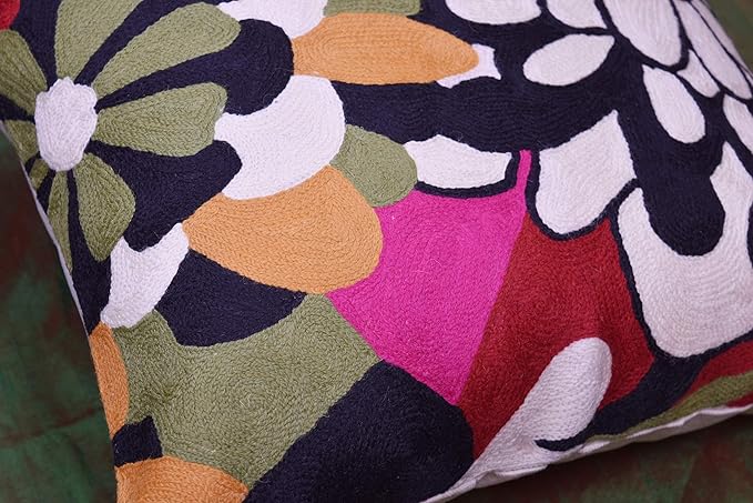 - ð FLORAL THROW PILLOW COVER - HAND EMBROIDERED: These colorful flower pillows are inspired from contemporary modern floral art designs and are hand embroidered in soft wool to perfection, stitch by stitch, by the finest artisans, creating an extraordinary all modern floral design pillow for your home decor. A close-up view of this all modern flower cushions allows you to see the amazing fine chain-stitch hand embroidery that covers the whole front side of this floral pillowcase.