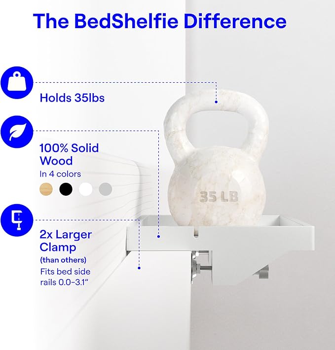 - ORIGINAL, TIME-TESTED DESIGN: Originally launched on Kickstarter and designed in Los Angeles, the BedShelfie bedside shelf has been featured in top publications like Apartment Therapy, BuzzFeed, and Real Simple. This innovative bed shelf organizer is perfect for small space living, whether in tiny bedrooms or dorm rooms with top bunks. The BedShelfie is the go-to choice for bedside organization, offering storage solutions for nightstands, loft beds, and floating shelves. Maximize your space with style and functionality!