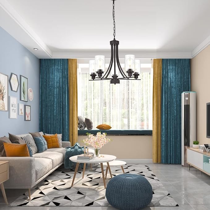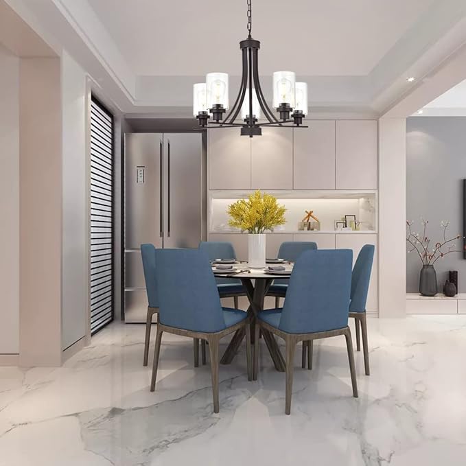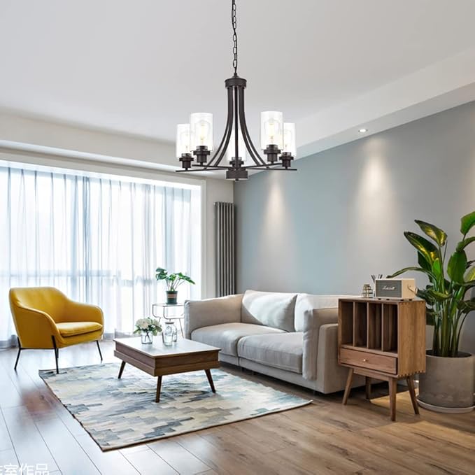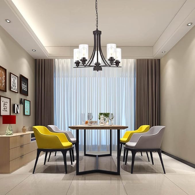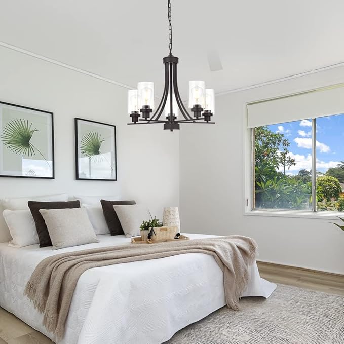 • 🌙 5 Light Glass Chandelier: This contemporary chandelier with high clear glass shadesit is an elegant update for traditional and modern homes alike.It's the perfect light fixture to install in kitchen, island, dining room,living room,foyers ,hallway,bedroom,coffee bar, lobby, restaurant and any space you like.