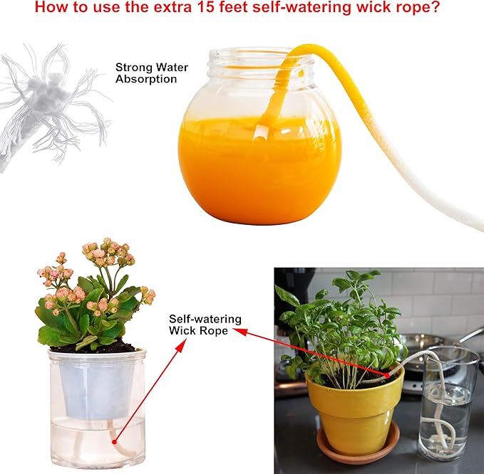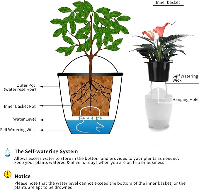 - Self-watering Wall Planter: Hanging planter pots designed with double-layer to allow excess water to store in bottom of this self-watering planter and provide to your plants as needed: automatically suck the water and nutrients up from the bottom of the outer cup via cotton rope wick to ensure plants take enough water they need for days, and you don't have to water them frequently. This clever hanging flower pots may help you care your plants when you go outside a couple days or on business.