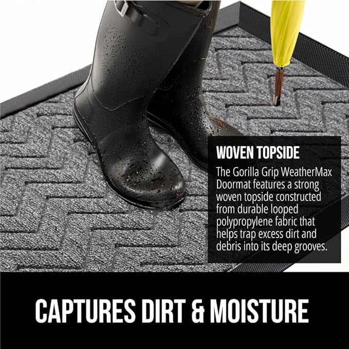 • THE ORIGINAL WEATHERMAX ALL SEASON DOORMAT: Gorilla Grip's Original WeatherMax doormat is built tough with a heavy duty, yet soft and flexible construction; deep grooves, beveled rubber border and retention dam help capture dirt, debris and moisture