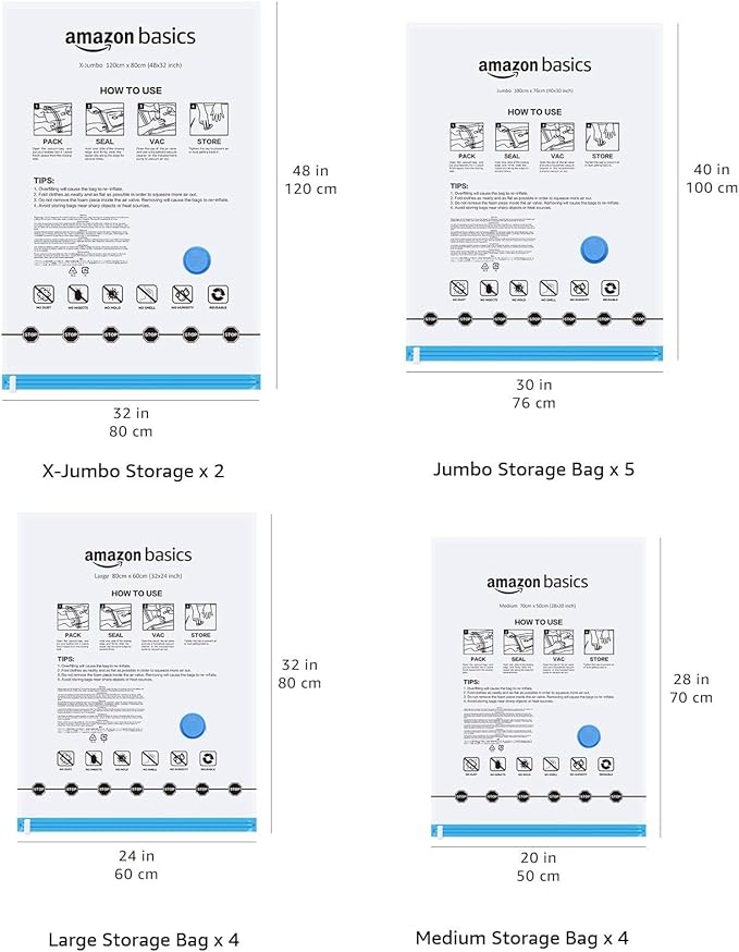 • 15-pack of assorted size vacuum storage compression bags for storing off-season clothes, towels, linens, and more
