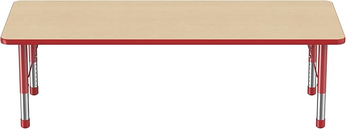 FDP Rectangle Activity School and Classroom Kids Table (30 x 72 inch), Chunky Toddler Leg, Adjustable Height 15-24 inches - Maple Top and Red Edge