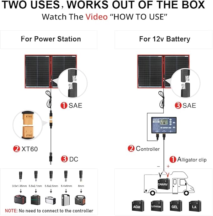 - 【COMPLETE KIT, READY TO GO】 Package includes the 100W foldable panel, separate controller, SAE/XT60/Alligator clips, DC5521/5525/35135/6440 adapters, 9.85ft cable, storage bag, and manual—a one-stop bundle for quick setup.