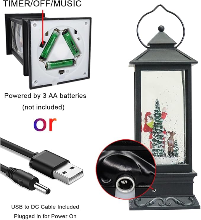 • ★POWER SUPPLY: Included USB to DC cable allows you operate the snow globe lantern without batteries. You can also operate it with 3 AA batteries, so that you can place it anywhere you want.