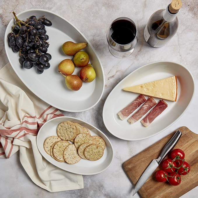 • CLASSIC WHITE It's elegant curves and smooth glossy textured finished in a natural white provides a timeless look which will look great for years to come. This set comes as a set of 3 generously sized Oval shaped serving bowls; Small- 9"L x 6"W, Medium- 11"L x 7.4"W, and Large- 13"L x 8.75"W.