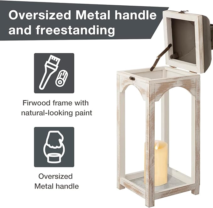 • FARMHOUSE DESIGN -- Painted by hand of white firwood with the roof in vintage style, this candle lantern features reflective galvanized metal floors. The knob top features a decorative loop. Each has a beautiful swing latch.