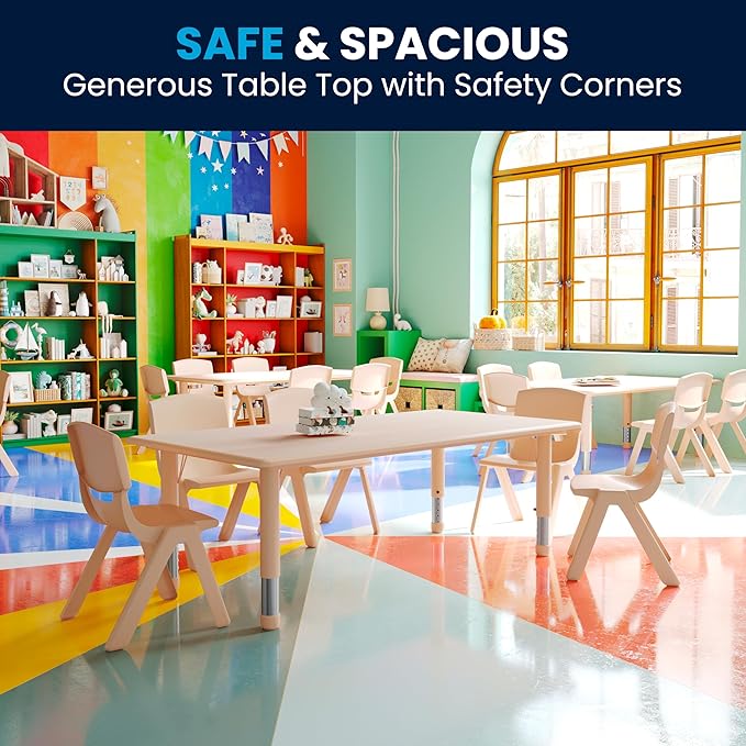 • SEATS UP TO 6 CHILDREN: Comfortably seats up to 6 children with plenty of room between each child and can be paired with 6 vibrant stackable school chairs with a height size of 6.5" to 14"