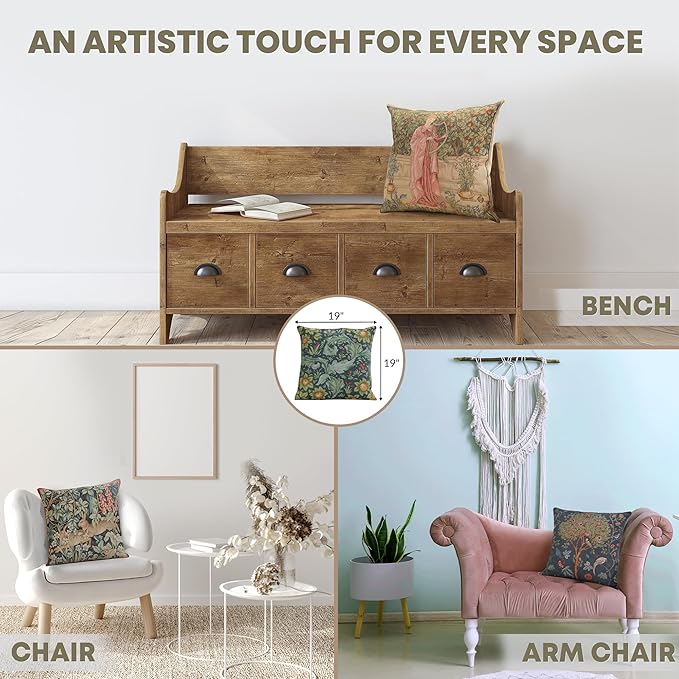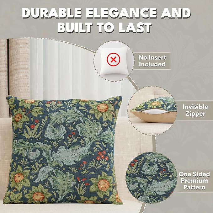 - Timeless Durability: Elevate your decor with our skin-friendly William Morris pillow covers 19âX19â, where quality and style come together. A sturdy hidden zipper ensures easy pillow insertion/removal, while the overlock stitches prevent seam ripping. Unlike thin printed cushion covers prone to tearing, our decorative pillows for couch with a super-soft backside are crafted with thick premium threads for long-lasting quality. THE PACKAGE INCLUDES A SINGLE TAPESTRY PILLOW COVER WITHOUT AN INSERT