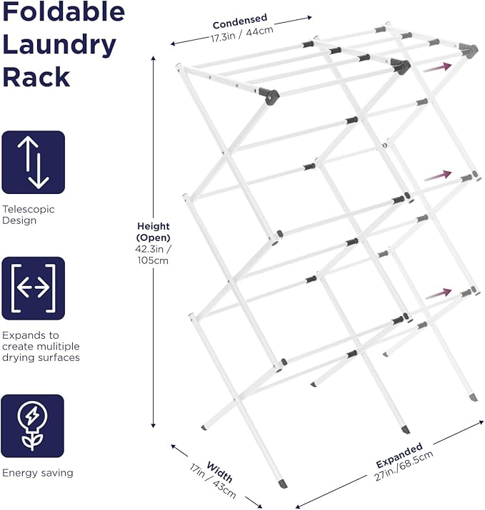 • FOLDABLE DRYING RACK: Collapsible drying rack for air-drying clothes and saving electricity consumption. The drying rack keeps items hanging neatly together and placed.