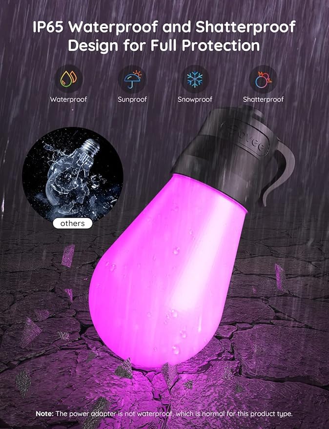 - IP65 Waterproof and Shatterproof: Enjoy year-round smart outdoor lights no matter the weather. The specially-designed plastic Govee outdoor decor are also shatterproof to survive knocks and falls. The power adapter is not waterproof.