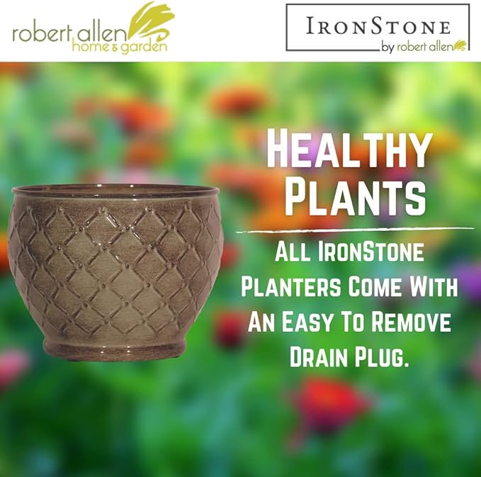 • -DRAINAGE – Contains a removable drain plug. Each IronStone planter comes with a drain plug that proves very useful whether inside or out during the changing seasons.