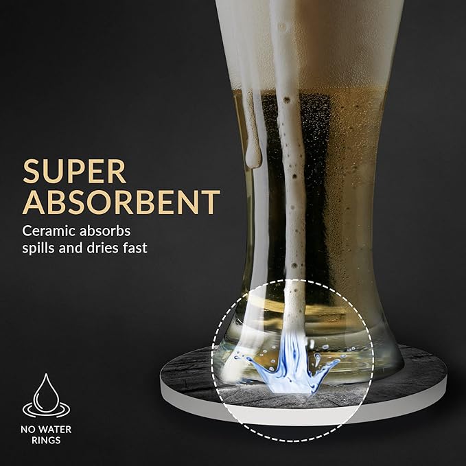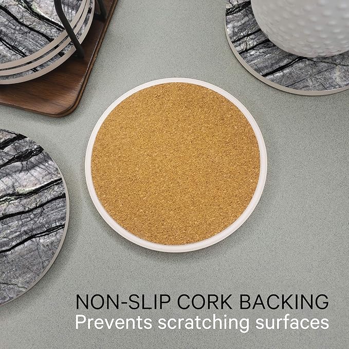 Emerson Coasters for Drinks Absorbent – Natural Stone Drink Coasters Set with Holder, Coasters for Coffee Table, Wooden Tabletop Protection Marble Style – 100% Heavy Duty Set of 6 (Obsidian)