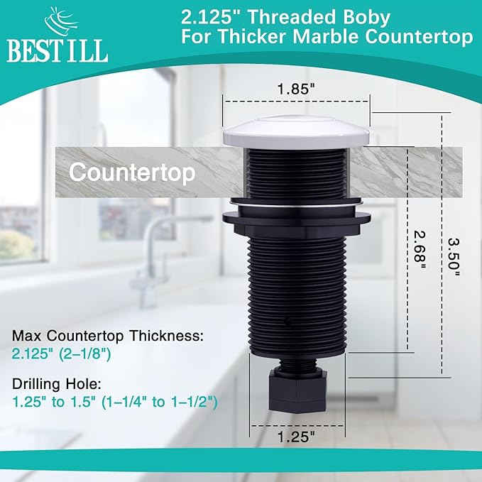 • EASY TO INSTALL - Garbage Disposal Switch Button can be easily mounted on any countertop or sinktop by drilling a 1-3/8-inch diameter hole. 3-inch thread plunger is not only for stainless steel sink top, but also for thick counter top like granite, marble, quartz, wooden and more.
