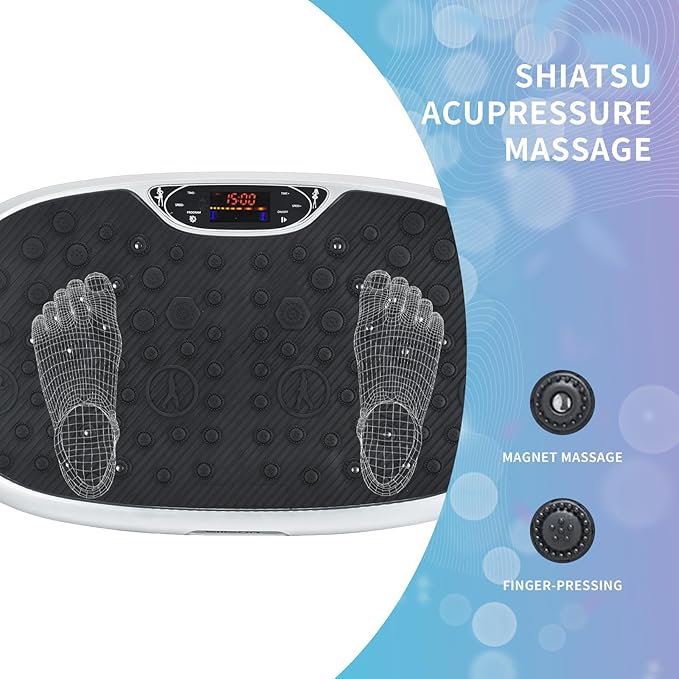 - VIBRATION PLATE WITH UNIQUE ACUPRESSURE SURFACE– Eilison OSCILLATING VIBRATION- 3D whole body vibration plate exercise machine has a unique acupressure plate surface which with the help of strong vibration from our vibration platform machine presses the pressure points on the feet which helps in relieving back pain, headache, insomnia, blood circulation, muscle & joint pain, stress, Anxiety. This workout machines helps you to release blocked energy to maintain healthy life