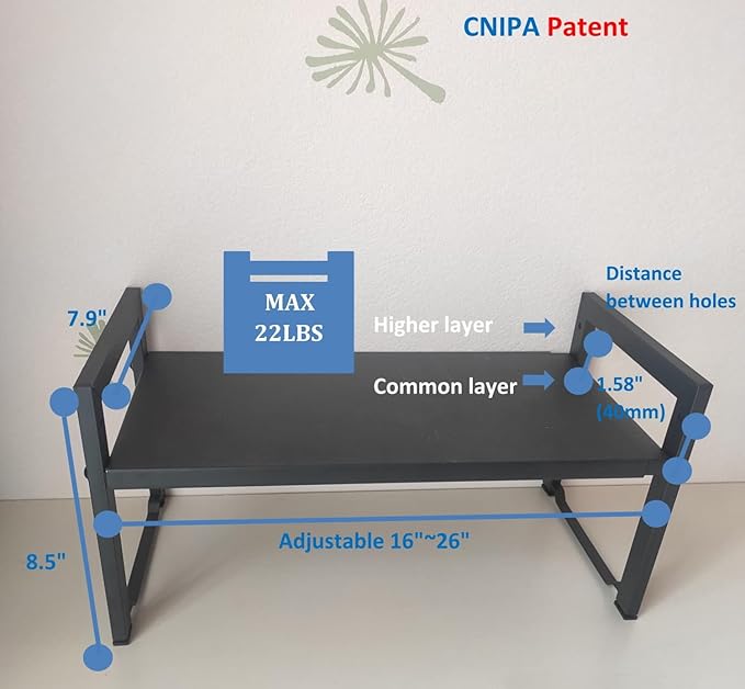 - Versatile Storage Solution: This expandable metal shelf is a versatile and sturdy storage option suitable for the kitchen, pantry, office, bedroom, or any other space where you need organized and accessible storage. With an adjustable length of 16-26 inches (L), 7.9 inches (D), 8.5 inches (H), and a height under the shelf of 7.1 inches, it can adapt to various cabinet or countertop sizes