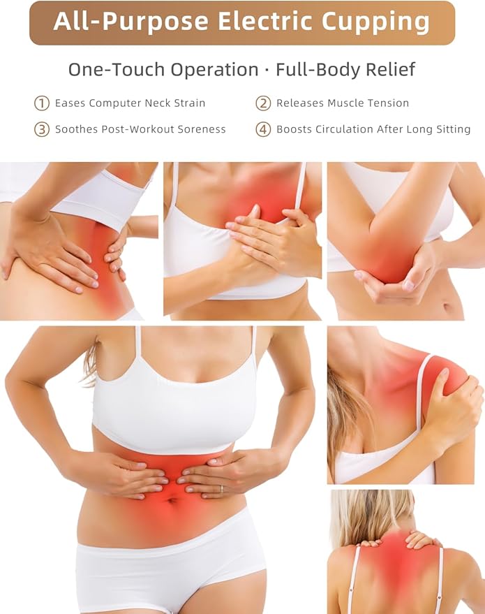 - 【One-Touch Smart Operation & Full Body Use】Our cupping therapy set electric features one-touch controls and an English manual for easy use. Designed for full-body relief, this cupping kit targets the back, shoulders, neck, arms, legs, and abdomen—loosening muscles and boosting circulation. With its ergonomic design, it’s both a therapy tool and a perfect wellness gift.