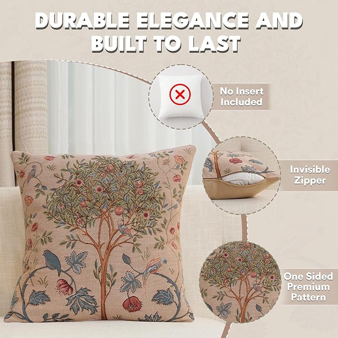 - Timeless Durability: Elevate your decor with our skin-friendly William Morris pillow covers 19âX19â, where quality and style come together. A sturdy hidden zipper ensures easy pillow insertion/removal, while the overlock stitches prevent seam ripping. Unlike thin printed cushion covers prone to tearing, our decorative pillows for couch with a super-soft backside are crafted with thick premium threads for long-lasting quality. THE PACKAGE INCLUDES A SINGLE TAPESTRY PILLOW COVER WITHOUT AN INSERT