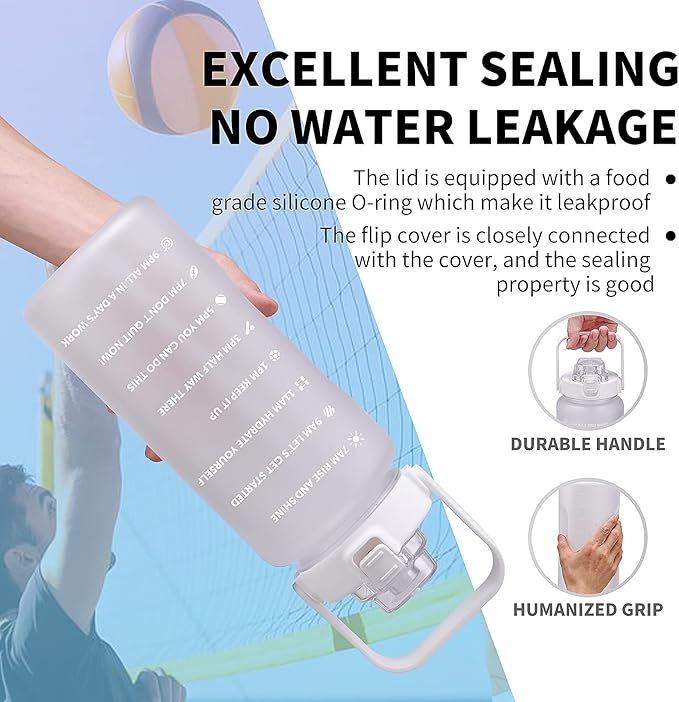 - 💪【Motivational Quote & Time Marker】The 64 oz - 2 liter large fitness water bottle jug with straw is with time markers and unique motivational measurement statements on it, the half gallon water bottle with tracker is the best choice of reminding you to stay motivated to drink enough water daily. It is important and easy for achieving healthy fitness goals including weight loss, muscle gain, keep hydrated and healthy with the motivational water bottle.