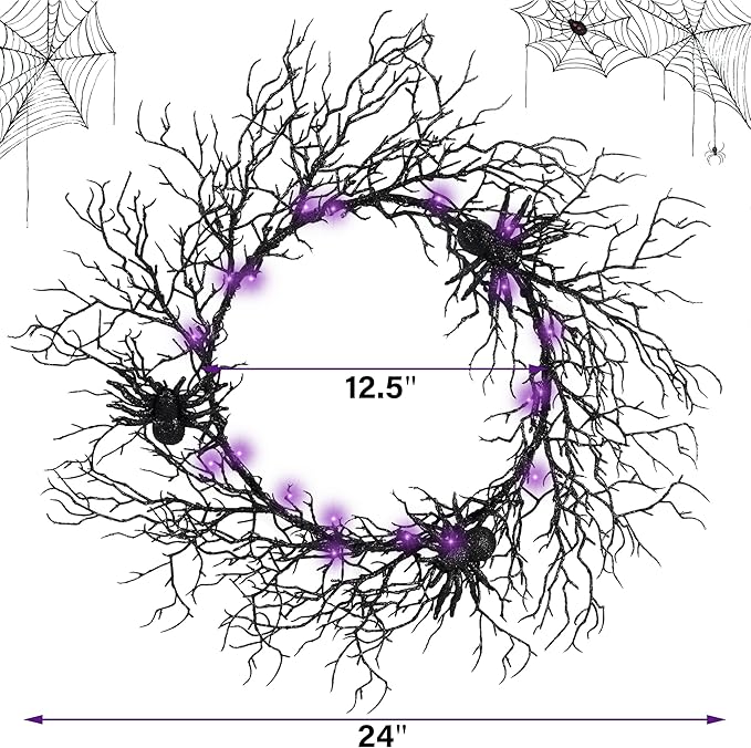 24 Inch Halloween Wreath for Front Door - Lighted Black Spider Wreath with Purple LED Lights, Outdoor/Indoor Spooky Decorations for Halloween Party, Porch, Holiday Home Decor