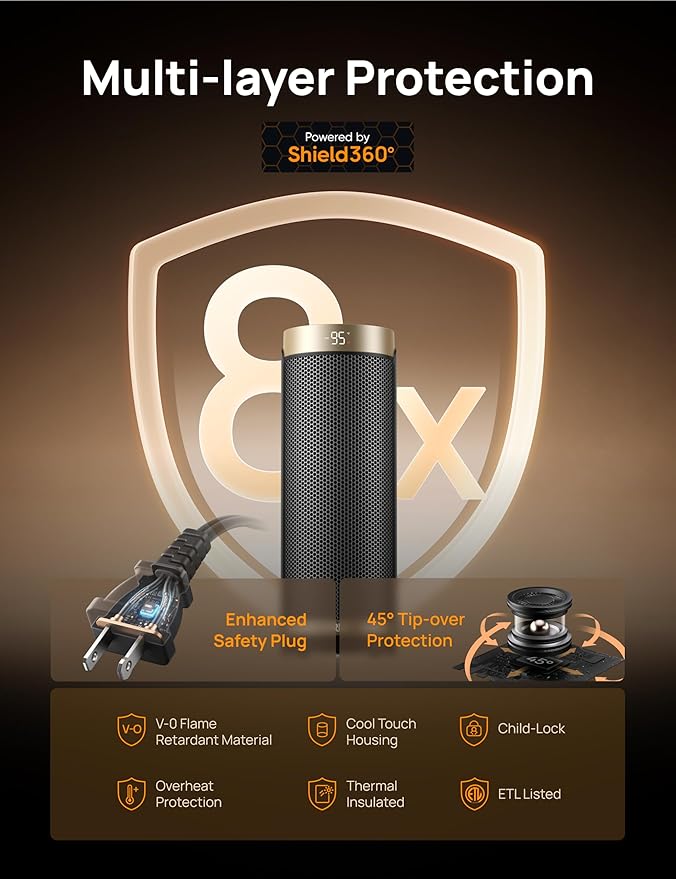- ETL-Certified Safety: Made of V0 flame-retardant materials with multiple safety features including built-in smart tip-over protection, overheat protection, 12-hour timer, 24-hour automatic power off without interaction, V0 flame retardant 2-prong plug, and sturdy 6ft long flat power cord. Safe and worry-free all-day use. Safety Reminder: Please do not use with an extension cord. Only plug directly into the wall outlet.
