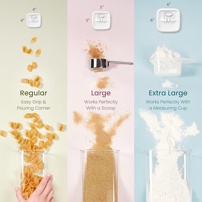 - AVAILABLE IN VARIOUS SIZES & SHAPES: The Felli Flip-Tite container comes in a variety of sizes and shapes to meet different food storage needs. The 4" REGULAR and RECTANGULAR sizes are perfect for organizing small kitchen counters and pantries, making handling and pouring easy. The 5" LARGE size is ideal for storing items like sugar and beans that need scooping. The 6" XL size is specifically designed for storing large quantities of food such as rice, powder, and flour, which require measuring spoons. We offer a versatile storage solution to suit all your needs.