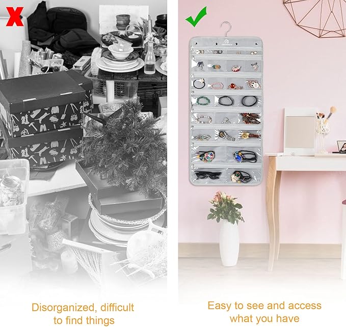- 2 VERSIONS TO CHOOSE FROM: In addition to the 50 pockets version, we offer an alternative hanging jewelry organizer with 25 transparent pockets and 23 Hooks! Choose whichever fits you and put all your rings, earrings, lockets, necklaces, watches, brooches, pins and other jewelry in order!