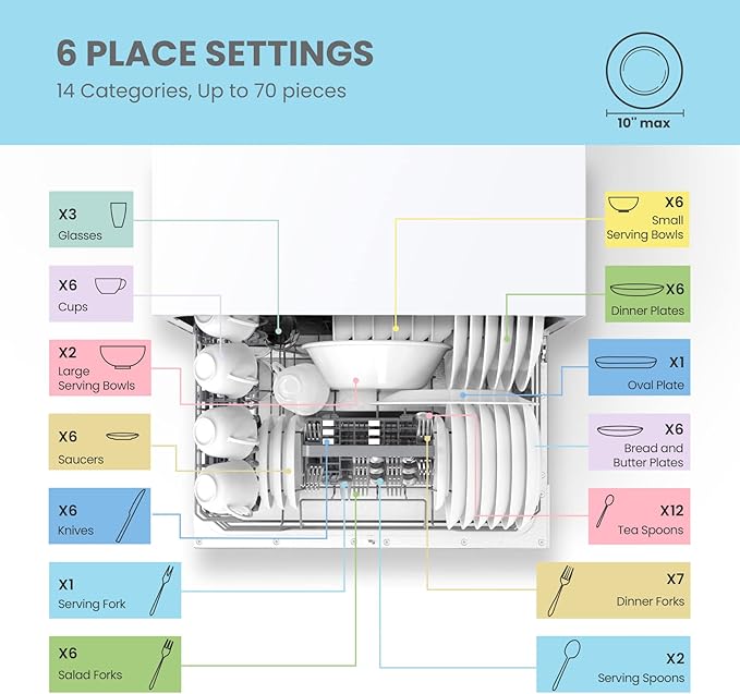 - 6 Place Setting- A perfect size (H17.2″×W21.6″×D19.7″) for 2-3 people, COMFEE’ compact dishwasher is suitable for dorms, RVs, and apartments. This countertop dishwasher can fit up to 70 pieces of tableware and has a plate size of up to 10 inches in diameter. Note: COMFEE dishwashers are tested at the factory before they are shipped. If your new dishwasher has some water inside, this is normal.