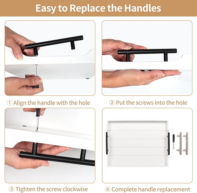 - 【SELECT YOUR HANDLE COLOR】Why not cost one money to get double happiness? Try our deluxe large white wooden tray for ottoman with 2 sets of metal handles. Now we offer two colors premium matte black and polished silver for replacement. Let's test your operational ability with the fantastic wood serving tray.