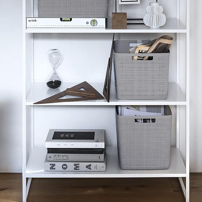 Curver Set of 4 Jute Large Cube Decorative Plastic Organization and Storage Baskets, Perfect Bins for Home Office, Closet Shelves, Kitchen Pantry and All Bedroom Essentials, Grey