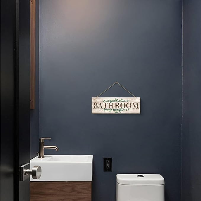 Bathroom Sign Wall Decor, Bathroom Wall Art with Plant Print, Rustic Farmhouse Wall Hanging Plaque Home Kitchen Decorative Bathroom, 4.7 x 13.7 inches