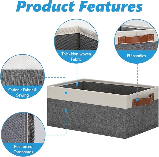 - 👍【QUALITY MATERIAL】Storage baskets for shelves are made of high-quality cationic fabric and polyester cotton fabric, and the inner layer is made of non-woven fabric, which is odorless, long-lasting and strong. Classic faux leather handles that adds a comfortable touch and provides a strong and comfort grip to pull and move. Fabric storage bin is easy to clean, just wipe with a damp sponge or cloth