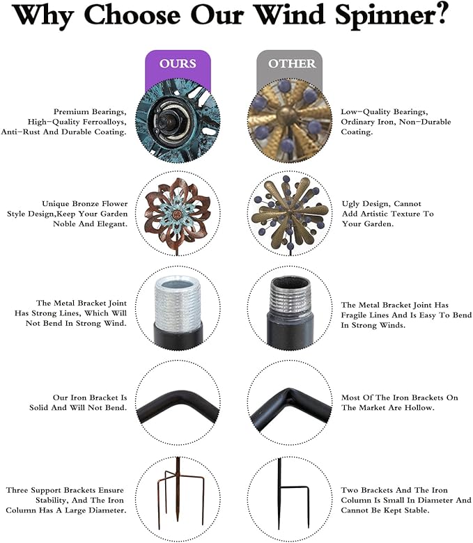 - Edge Blunting: Protect your hands when installing and using kinetic wind spinner, not easy to get hurt. Provide easy-understand installation instructions, you can finish assembling in minutes