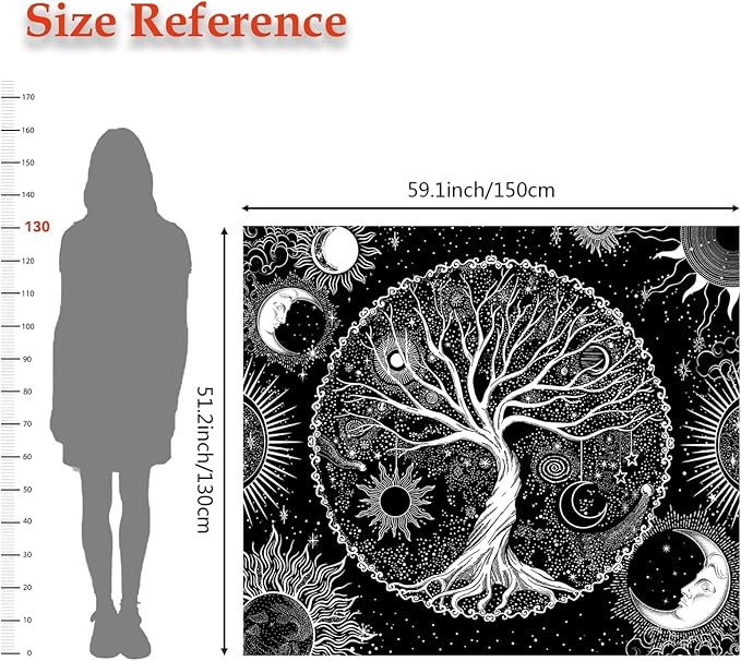 • This wall tapestry is unique design with tree, sun, moon, stars, and galaxy space elements. It's made from high quality polyester fabric, which is skin-friendly, soft, lightweight, durable, and has no peculiar smell