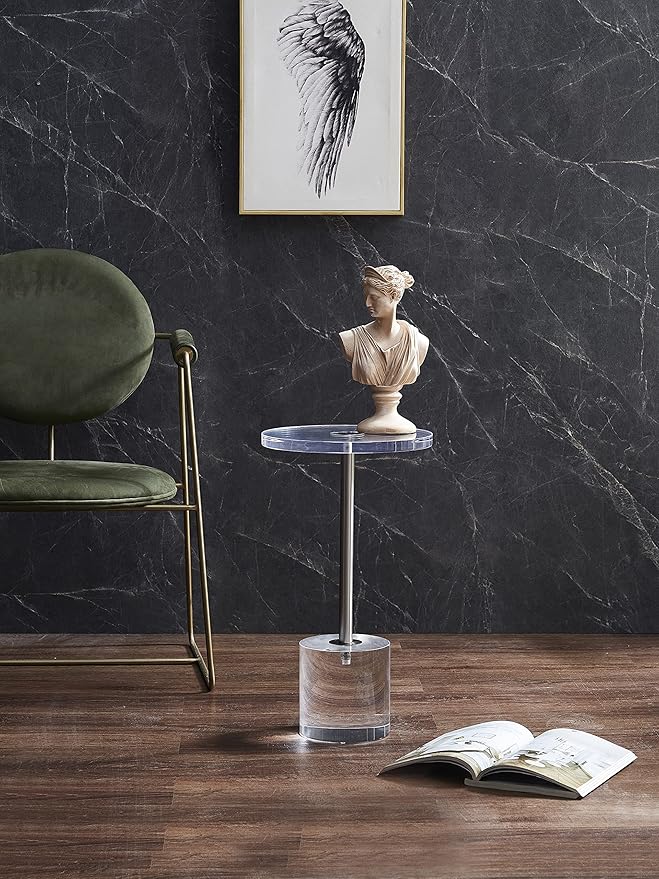 Clear Acrylic End Table,Side Table,Brushed Silver Metal,Round,for Office, Living Room and Bedroom,Easy Assembly,12x12 inch,21.3 inch high