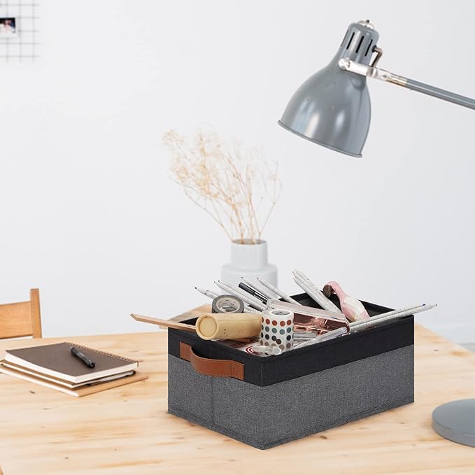- 【QUALITY MATERIAL】Storage baskets for shelves are made of high-quality cationic fabric and polyester cotton fabric, and the inner layer is made of non-woven fabric, which is odorless, long-lasting and strong. Classic faux leather handles that adds a comfortable touch and provides a strong and comfort grip to pull and move. Fabric storage bin is easy to clean, just wipe with a damp sponge or cloth