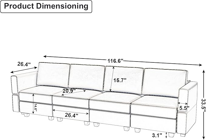 - Easy to Assemble: Letâs enjoy the fun of assembling the sofa and reshaping your room. No extra tools needed, just follow a few steps in assembly instruction. Overall size:116.60 ''(L)*26.40 ''(W)"*33.50"(H), ottoman size: 26.40'' (L) x 26.40'' (W)x 17.70''(H).