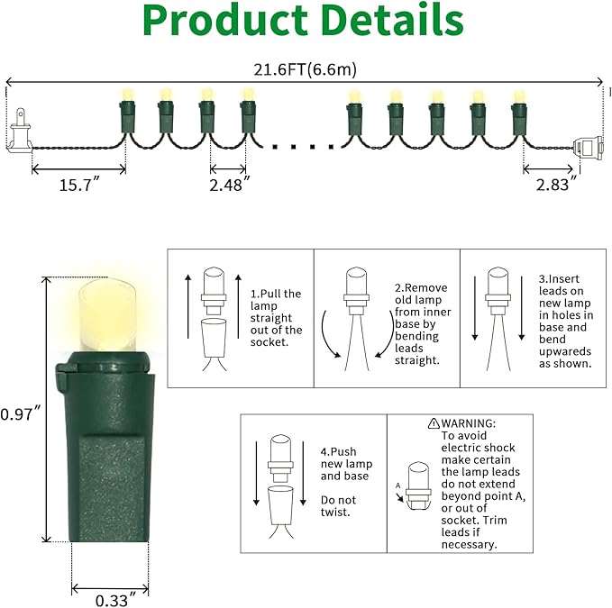 • 5mm LED Christmas Lights: 100 counts warm white 5mm wide angle stable LED string lights spaced 6.3 inches apart with green wire. 7.1 inch leads have a stackable male plug and 5.9 inch tails have a female plug for easy end to end connection.