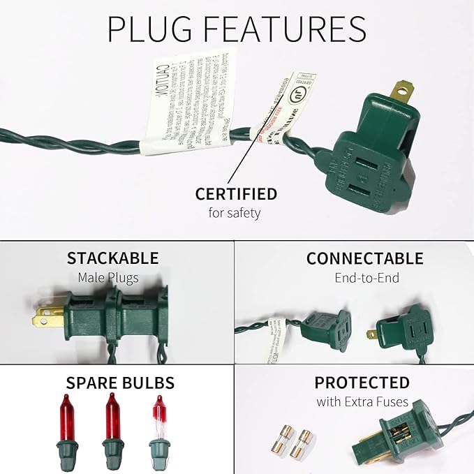 • Product Nature:Each mini Christmas light set comes with end-to-end plug, can be connectable up to 5 sets (500 lights). Each bulb space 2.5in, 2.5V and 0.425W per bulbs, built-in 3A fuse for safe use. Extra bulbs and fuses are included.