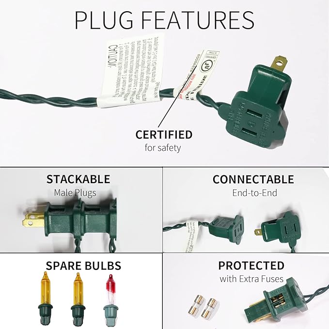 • Product Nature:Each mini Christmas light set comes with end-to-end plug, can be connectable up to 5 sets (500 lights). Each bulb space 2.5in, 2.5V and 0.425W per bulbs, built-in 3A fuse for safe use. Extra bulbs and fuses are included.