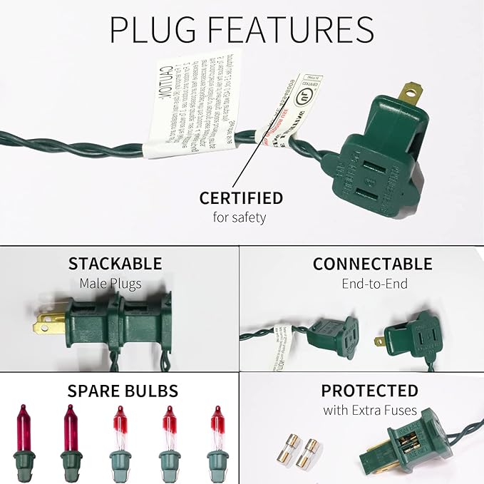 • Product Nature:Each mini Christmas light set comes with end-to-end plug, can be connectable up to 3sets (450 lights). Each bulb space 2.5in, 2.5V and 0.425W per bulbs, built-in 3A fuse for safe use. Extra bulbs and fuses are included.