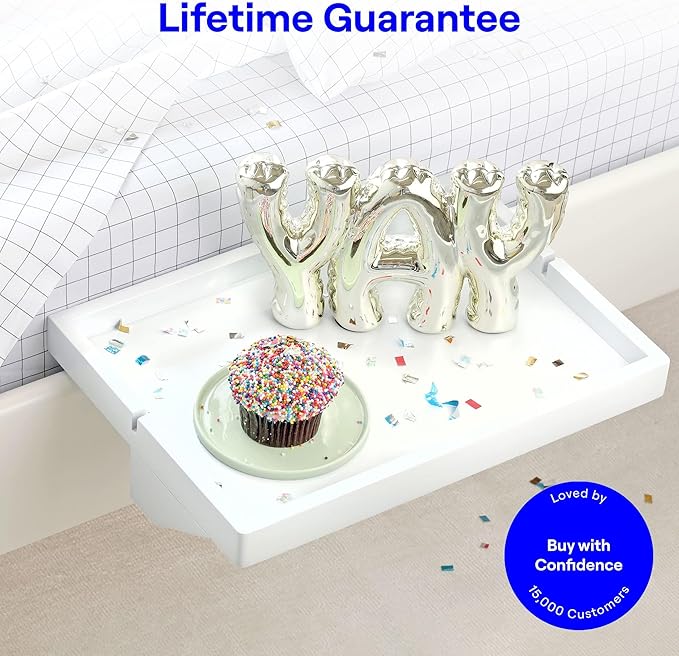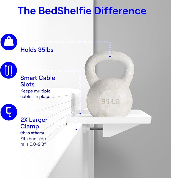 - EFFORTLESS DESIGN, ENDLESS VERSATILITY The BedShelfie caddy tray is all about simplicity and convenienceâno complicated setup required. Whether you're using it as a headboard shelf, sofa tray, changing table, or cord organizer, it adapts to your lifestyle with ease. Loved by city dwellers and students alike, it's a dorm room essential, teen nightstand, or kid-friendly side table. With a sturdy 35lb weight capacity, it securely holds everything from your 13-inch MacBook to your phone and water bottle. Perfect as a floating nightstand or compact shelf for bunk beds, loft beds, and college dormsâcomplete with a built-in cup holder that slides right into bed life.