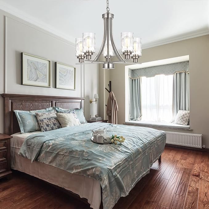 • πŸ’Ž5 Light Glass Chandelier: This contemporary chandelier with high clear glass shades,it is an elegant update for traditional and modern homes alike.It's the perfect light fixture to install in kitchen, island, dining room,living room,foyers ,hallway,bedroom,coffee bar, lobby, restaurant and any space you like.