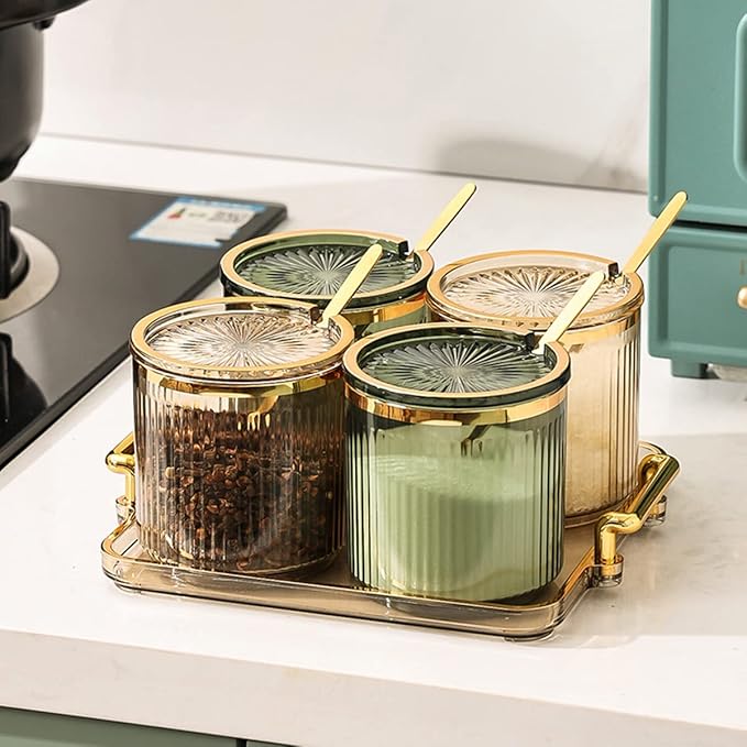 Acrylic Condiment Spice Jars,Condiment Spice Box With Lids and Spoons and Tray,Clear Plastic Sugar Salt Canisters,Seasoning Box 4 Pack,Seasoning Box Set for Kitchen to Storage Salt,Paprika,Sugar