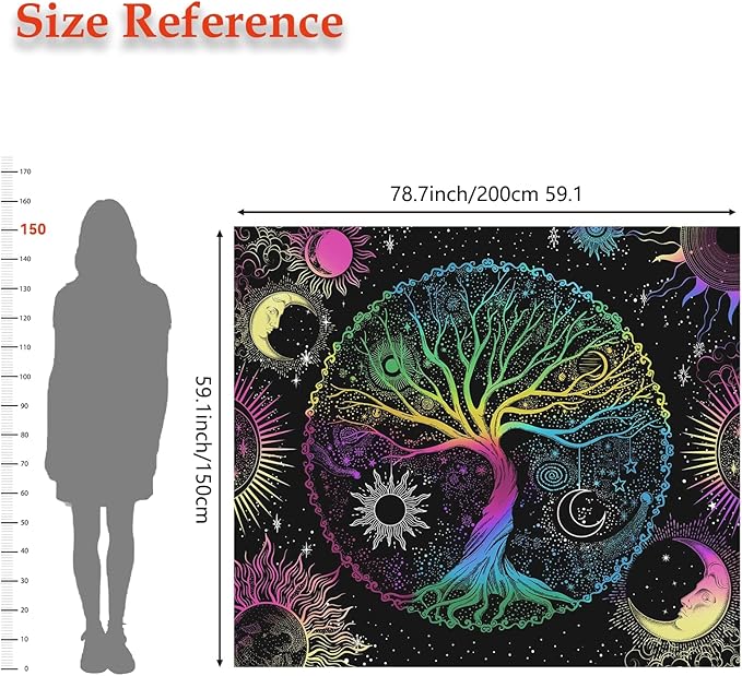 • This tapestry is unique design with tree, sun, moon, stars, and galaxy space elements. It's made from high-quality polyester fabric, which is skin-friendly, soft, lightweight, durable, and has no peculiar smell. It adopts HD-printing technology, non-fading. Feathering vivid colors, crisp lines and delicate hemming
