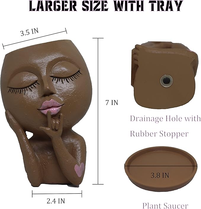 - ðĩ Size of Planter Pots: The size of this unique head vase is carefully designed by us. Based on sociology and aesthetics, we found this size to be the perfect way to make this vase funny and cute. The opening diameter of the flower planter is 3.5 inches, bottom length is 2.4 inches, height is 7 inches. The Diameter of the tray is 3.8 inches.